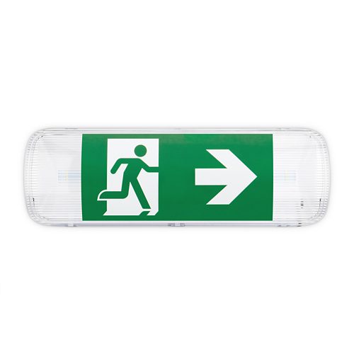 3 W JCC emergency bulkhead with IP65 ingress protection, 6000 K colour temperature, and full exit legend kit for up/down/left/right signage.